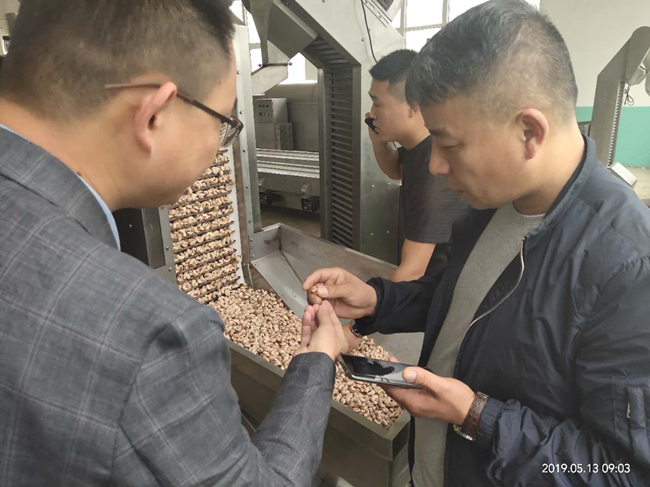 山東客戶自帶越南腰果到許昌智工試機(jī)6米流水線電磁炒貨機(jī)