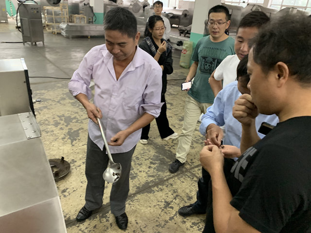 10月4日江西撫州客戶一行四人驅(qū)車千里來廠考察試機炒制五香西瓜子!